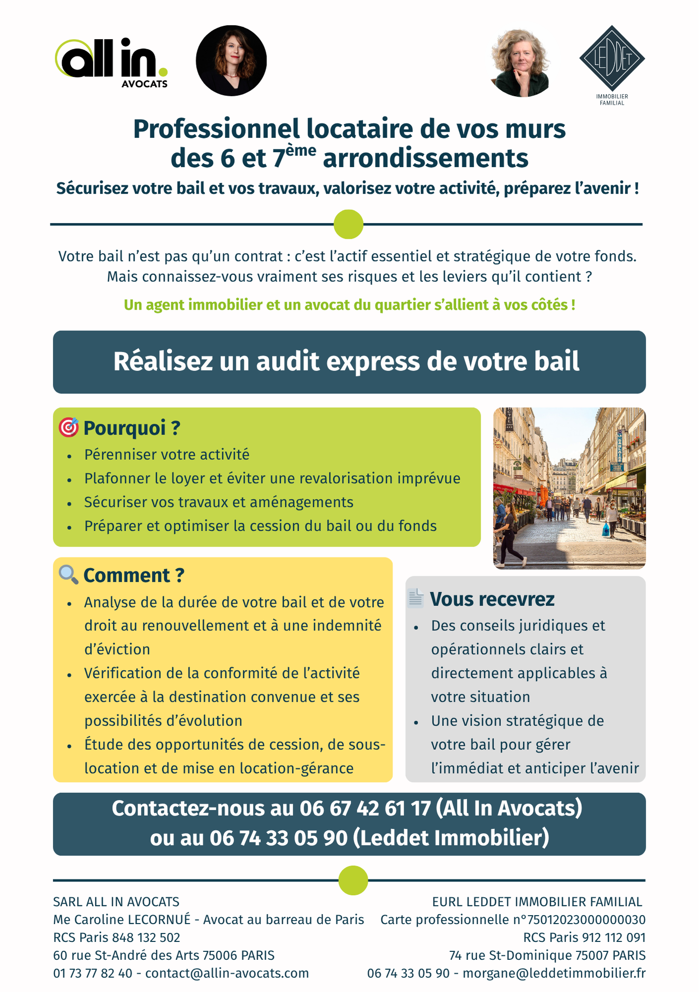 Réalisez un audit express de votre bail pour pérenniser votre activité, plafonner le loyer et éviter une revalorisation imprévue, sécuriser vos travaux et aménagements, préparer et optimiser la cession du bail ou du fonds